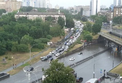 "По информации КК "Киевавтодор" основной причиной подтоплений улично-дорожной сети города является сверхнормативное количество осадков и залповых ливней, а также значительное увеличение твердого стока (то есть суммарного количества зависших и донных наносов за определенный промежуток времени. — Ред.). Во время осадков наблюдалось резкое повышение уровня воды в р. Лыбидь, что уменьшило пропускную способность подключенных к ней коллекторов дождевой канализации", — сообщила начальница управления информационного обеспечения КГГА Екатерина Баранова.