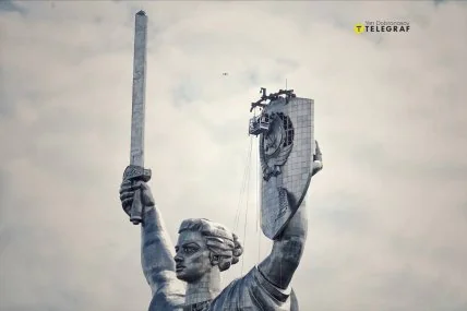 В Киеве продолжаются работы по демонтажу советской символики с монумента "Родина-мать", а некоторые элементы уже успешно убрали.
