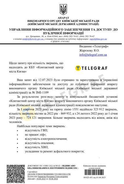 Об этом по информационному запросу "Телеграфу" сообщили в коммунальном бюджетном учреждении "Контактный центр города Киева" аппарата исполнительного органа Киевского городского совета (КГГА).