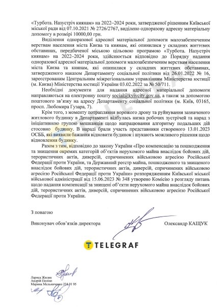 В комментарии "Телеграфу" глава ОСМД дома на Жилянской Татьяна Махринская сообщила, что жители считают результаты госэкспертизы победой. При этом, по ее словам, потерявшие жилье люди до сих пор не согласились переезжать в спальные районы в те квартиры, которые им после смертельной атаки "Шахеда" предложили городские власти.