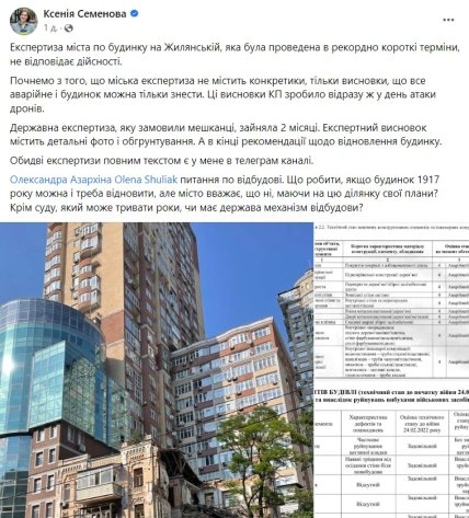 Ранее депутат Киевсовета Ксения Семенова традиционно была более резкой относительно позиции власти города: "Экспертиза города по дому на Жилянской, которая была проведена в рекордно короткие сроки, не соответствует действительности. Начнем с того, что городская экспертиза не содержит конкретики, только выводы, что все аварийное и дом можно только снести".