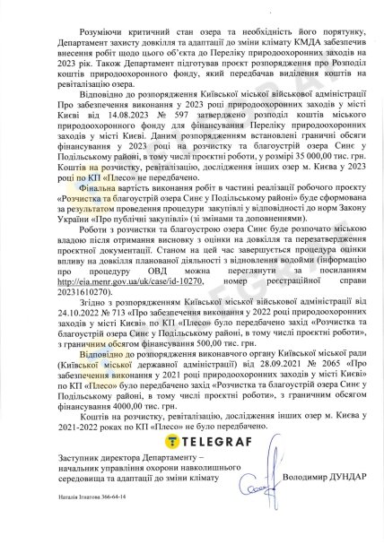 Вместе с тем, по информации департамента защиты окружающей среды и адаптации изменения климата КГГА, средства для КП "Плесо" на расчистку, ревитализацию, исследования других озер Киева в 2023 году не предусмотрены. Также не выделяли на это финансирование и в 2021-2022 гг.