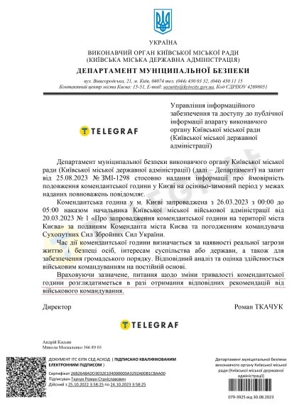 Официально в КГГА по запросу "Телеграфа" сообщили, что время действия комендантского часа определяется при наличии "реальной угрозы жизни и безопасности лиц, интересам общества или государства, а также для обеспечения общественного порядка".