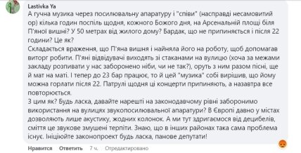 Отметим, в комментариях под постом депутата горожане сообщили о нескольких заведениях-нарушителях. Одно из них, как оказывается, расположено недалеко от Правительственного квартала возле метро "Арсенальная", и уже долгое время посетители этой точки донимают местных жителей пьяным пением и шумом.