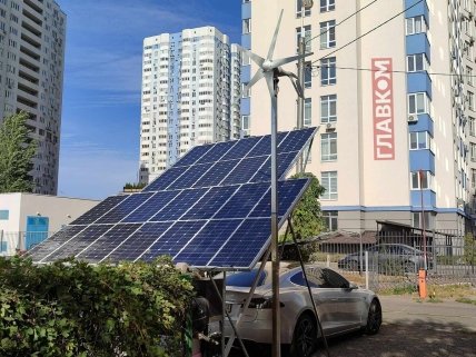 Как пишет Главком, чудо инженерной мысли было обнаружено на Позняках во дворе одной из многоэтажек, где владелец Tesla Model S обустроил зарядную станцию с использованием солнечных панелей и ветрогенератора.