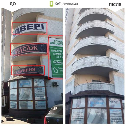 В столице вывески, которые располагаются на балконах, являются незаконными и подлежат демонтажу. Согласно действующему законодательству, в Киеве не разрешено размещать рекламные баннера на балконах жилых, офисных и других зданий.