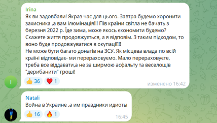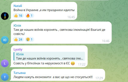 В комментариях люди пишут о том, что сейчас не те времена, когда можно настолько беспечно тратить электроэнергию на иллюминацию. Некоторые даже начали настаивать на том, что у чиновников "нет совести" и вывешивать гирлянды в то время, когда хоронят наших воинов — это, как минимум, неуважение.