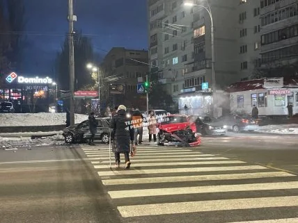 Во вторник, 5 декабря, в Соломенском районе Киева произошла авария при участии двух легковых автомобилей. В результате столкновения, одна из машин слетела с проезжей части и врезалась в бетонный столб.