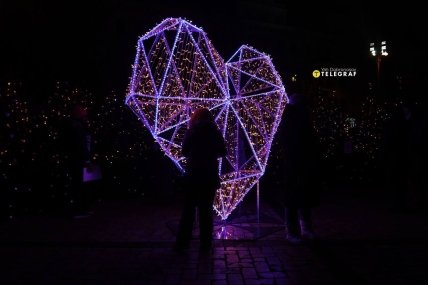 Рядом с елкой обустроена фотозона в виде сердца, которая посвящена украинским воинам. Ведь 6 декабря не только День Святого Николая, но и День ВСУ. Вокруг сердца также размещены елки поменьше, которые украшены желто-синими сердцами.