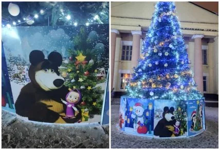 В поселке Коцюбинское Бучанского района Киевской области установили центральную новогоднюю елку, которую задекорировали плакатами с изображением героев популярного российского мультика "Маша и медведь", а также иллюстрациями Деда Мороза со Снегурочкой. Местные жители обратили внимание на такое "украшение" и возмутились тем, что во время полномасштабного вторжения местные власти пиарят медийные продукты оккупантов.