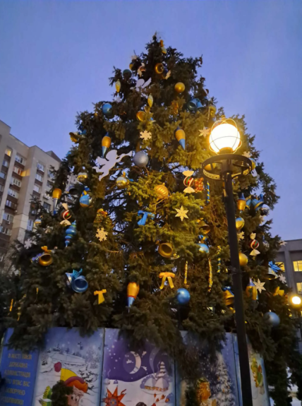 На Оболони украсили живое дерево, которое растет во дворе РГА. Его декорировали игрушками, приобретенными еще до начала полномасштабной войны.
