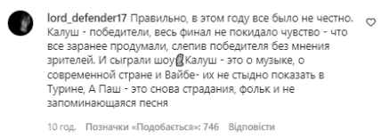 Украинцы высказались в соцсетях, что конкурс "продажный" и победителем должен был стать именно Kalush. По словам пользователей Инстаграма, музыканта просто слили.