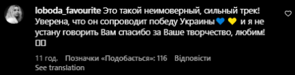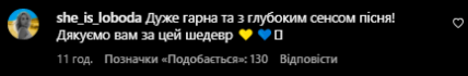 Так, среди восхищенных комментариев, к примеру, "Очень красивая и с глубоким смыслом песня! Спасибо вам за этот шедевр", "Это такой неимоверный, сильный трек! Уверена, что он сопроводит победу Украины и я не устану говорить Вам спасибо за Ваше творчество, любим", "Обожаю вас. Вы такая молодец", есть и более негативные отзывы.