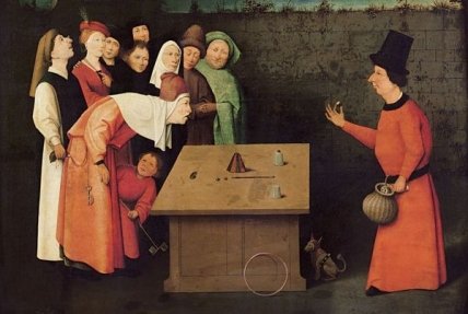 На первый взгляд, картина "Фокусник" — незатейливый образчик жанровой живописи. Катала дурачит простака посредством старого как мир трюка с "наперстками". Пока тот зачарованно следит за руками, уличный воришка "подрезает" его кошелек. Один из зевак, воспользовавшись тем, что всеобщее внимание приковано к столу фокусника,щупает девицу. За происходящим с живым интересом наблюдают сова, специально обученная собачка и переодетый монахиней Путин — у него здесь явно свой интерес.