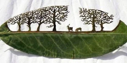 Мы уже ранее писали о резьбе по листьям, но теперь это совсем другая резьба. Речь пойдёт о вырезании отдельных участков из листьев разных деревьев. Работа очень тонкая и требует максимального внимания. Ведь одно неловкое движение и всё будет испорчено. Своё творчество, как художник, Дюран начинал с обычного холста и красок, потом заинтересовался древней китайской техникой резьбы по бумаге и захотел попробовать её на листьях.