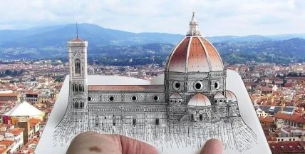 Куда бы ни отправлялся итальянский художник Пьетро Катауделла (Pietro Cataudella), он повсюду берет с собой блокнот. Но его рисунки не просто изображают места, которые он посещает, — они становятся частью пейзажа или ландшафта. Его продолжающийся проект под названием "Живые городские зарисовки" (City Live Sketch) состоит из преимущественно архитектурных трехмерных рисунков, которые, кажется, врываются в реальность со страниц блокнота, изображая знаменитые достопримечательности, полуреальные, полурисованные. А недавно художник поднял свою фантазию еще на один уровень вверх, и теперь его рисунки игриво объединяют сооружения и повседневные предметы с неожиданными персонажами и мультяшными мирами.