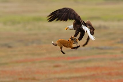 Белоголовый орлан - хищная птица из семейства ястребиных. Одну из следующих фотосессий фотограф Кевин решил посвятить лисам, и для этого отправился в природный парк округа Сан-Хуан в штате Вашингтон. Там он наблюдал за молодой лисой, поймавшей кролика, как вдруг… на нее налетел белоголовый орлан и вцепился когтями в добычу. Но и лиса не собиралась с нею расставаться, и в результате птица подняла в воздух и охотницу, и ее жертву.