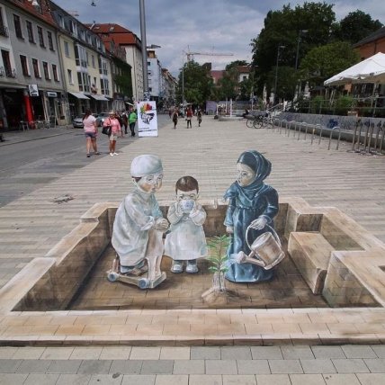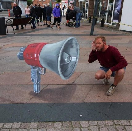 Он создает на асфальте объемные рисунки, которые нужно потрогать рукой, чтобы убедиться в обмане зрения.