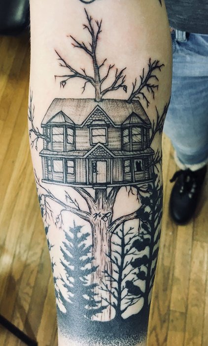 "Я сделал тату моих родителей, собаки и дома. Это дом, который построили мои родители, собака в окне, и инициалы моих родителей, их почерком. Я вырос здесь.