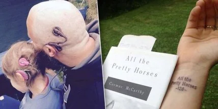 "Мой отец умер до моего рождения, я никогда не видел его. Но все, кто знал его, говорили, что я копия своего отца. В свой последний год в школе я выбрал из всего списка литературы „Кони, кони“ Кормака Маккарти. Увидев, что я читаю эту книгу, мама побежала в свою комнату и вернулась с точной такой же книгой 1993 года. Закладка лежала на странице 128. Оказалось, что отец читал эту книгу до своей смерти. И тогда я решил сделать татуировку, которая бы отмечала мою связь с отцом, ведь она есть, несмотря на то что я с ним даже не виделась".