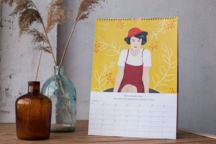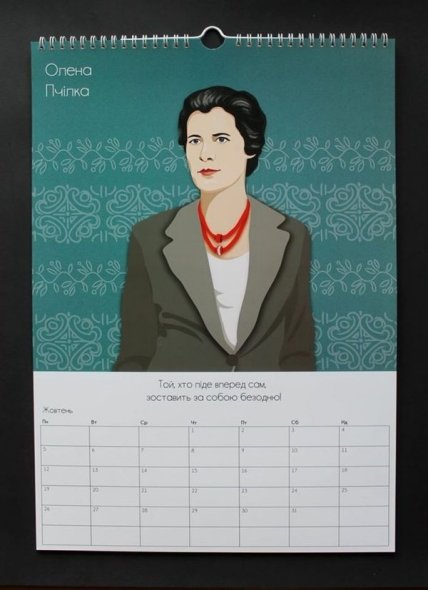 Каждая иллюстрация уникальная и особенная: январь — Василий Стус, февраль — Ольга Кобылянская, март Василий Симоненко, апрель — Леся Украинка, май — Валериян Пидмогильный, июнь — Олена Телига, июль — Евгений Плужник, август — Марко Вовчок, сентябрь — Майк Йохансен, октябрь — Олена Пчилка, ноябрь — Валериян Полищук, декабрь — Наталья Кобринская.