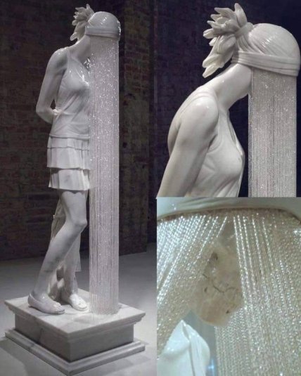 Девушка-призрак – это работа британского скульптора Кевина Фрэнсиса Грея (Kevin Francis Gray). Лицо девушки покрыто длинной вуалью из кристаллов. Любопытный человек может заглянуть под вуаль и увидит там череп. Руки девушки покрыты шрамами. Так художник изобразил человека, который не хочет принимать реальность.