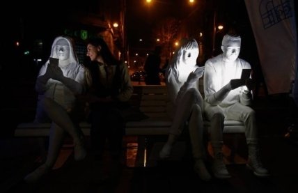 Эта работа британского скульптора Гали Мэй Лукас (Gali May Lucas) стала частью Амстердамского Фестиваля света (Gali May Lucas) и должна была подчеркнуть одержимость людей технологиями и смартфонами. Три фигуры сидят на скамейке в позе, в которой обычно сидят пользователи смартфона, и пишут текстовые сообщения. Их лица освещены экранами. По словам скульптора, ее идея заключалась в том, чтобы показать, как люди притянуты к этим экранам. Но их свет не только дает нам информацию, но и уводит нас от реального мира.