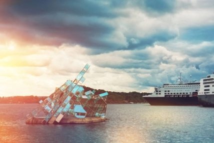 Эта скульптура плавает в воде на бетонной платформе и вращается под влиянием ветров и приливов, напоминая нам о постоянных изменениях погоды. Она похожа на ледник: вода отражается в ее стеклянных панелях. Эта массивная скала "льда" является символом могущества и величия Севера. И тот факт, что скульптура может двигаться, показывает, что природа сильнее и может свести на нет все наши усилия, что следует принимать во внимание.