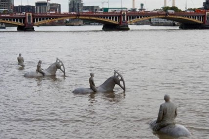Четыре всадника на берегу Темзы исчезают и появляются в зависимости от времени суток. Художник, скульптор и защитник окружающей среды Джейсон деКейрс Тейлор (Jason deCaires Taylor) создал эту композицию, чтобы привлечь внимание общественности к чрезмерной зависимости людей от нефти и напомнить нам о том, как наша современная промышленность влияет на изменение климата. Как вы видите, вместо голов у лошадей – нефтяные насосы. Фигуры, одетые в костюмы, сидят на лошадях и куда-то смотрят - это прямая отсылка к политикам и бизнесменам, которые берут от природы столько, сколько могут унести, игнорируя все побочные эффекты.