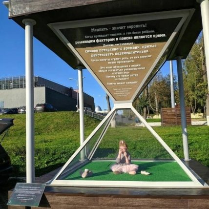 Памятник был создан спасательной группой Lisa alеrt (российский аналог Amber alеrt). Внутри песочных часов находится кукла, которая выглядит как 6-летний ребенок, а другая часть часов заполнена песком. Смысл памятника понятен: при поиске детей важна каждая секунда.