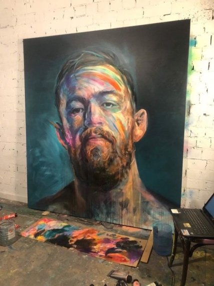 Одна из представленных работ – портрет Конора МакГрегора, ирландского бойца ММА и автора самого быстрого нокаута в истории UFC. Художник создал картину во время самого короткого поединка МакГрегора против Дональда Серроне. Бой длился всего 40 секунд. Столько времени хватило ирландском бойцу, чтобы победить своего соперника, а художнику Евгению Лапченко, чтобы создать первую часть портрета Конора.