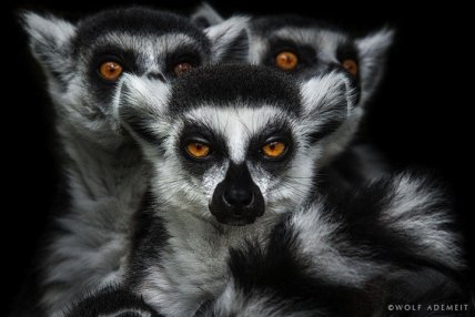 Даже в групповом снимке лемуров, фотограф фиксирует индивидуальность каждого субъекта с собственными выражениями лица и языка тела.