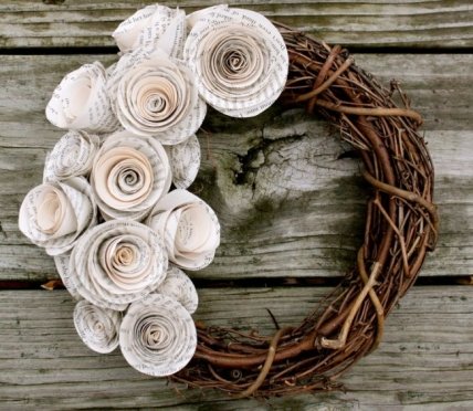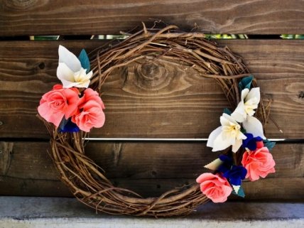 Венок в стиле рустик, украшенный бумажными цветами