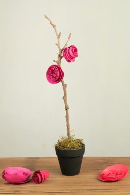Простой способ создать украшение для дома — бумажные розочки на сухой ветке.