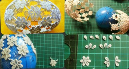 Для начала необходимо ознакомиться с особенностями данной техники. Полоски бумаги скручиваются и формируется в определённые узоры, далее все элементы склеиваются между собой. Таким образом можно украшать натуральные яйца, обклеивая скорлупу или создавать декоративные шедевры.