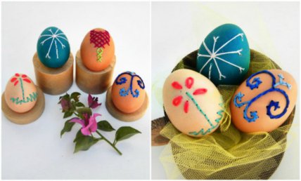Вышивать можно не только на ткани. В этой технике также используется только яичная скорлупа, поэтому предварительно её необходимо подготовить: содержимое яйца удалить и дать просохнуть изнутри. После этого аккуратно прокалываются дырочки специальными инструментами. Нитки можно брать любые, желательно ярких цветов, а вот ленточки лучше выбирать потоньше. Стоит отметить, это весьма кропотливая работа с хрупким предметом, поэтому требует усидчивости и сосредоточенности от человека, который будет её выполнять.