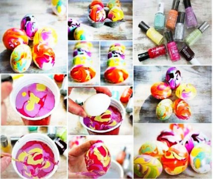 Такой необычный способ подходит не только для маникюра но и в качестве пасхального декора. Хорошая возможность дать "вторую жизнь" лакам для ногтей, поскольку можно взять уже подсохшие. Для того чтобы воспользоваться этим методом нужно в чашку с водой поочерёдно налить лаки и опустить туда пустую скорлупу, предварительно закрепив её на палочке. Таким образом удастся без повреждений вытащить готовое изделие и не испачкать руки.