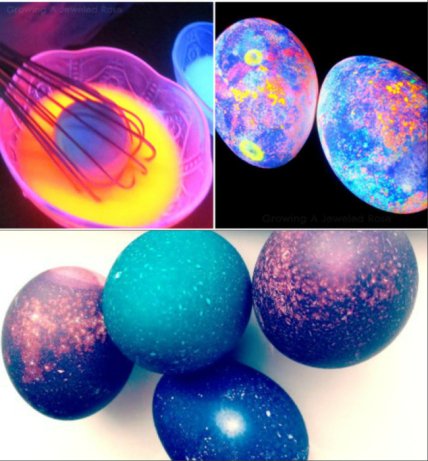 Стоит выделить необыкновенный способ окрашивания "космических" яиц. Такая техника привлекает внимание и уводит от канонов традиционной росписи. Создать их очень просто, достаточно взять несколько красителей и пропитать ими салфетку, завернуть и оставить часа на четыре. Добавление флуоресцентных красок усилит футуристический эффект, дав возможность писанке светиться в темноте.