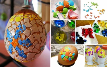 Для декора яиц в этой технике необходимо подготовить пустую белую скорлупу, предварительно окрашенную. На белое яйцо наклеить кусочки цветной скорлупы, оставляя небольшие расстояния между ними. Получившаяся мозаика будет выглядеть великолепно, причем как однотонная так и разноцветная.