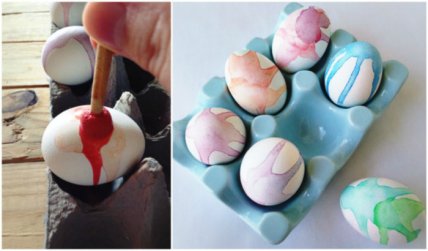 Данную технику можно назвать "ленивой", или не требующей выдающихся талантов в сфере изобразительного искусства. Достаточно лишь окунуть кисть, прижать к скорлупе и дать возможность акварельной краске хаотично стечь. Высыхают такие узоры очень быстро. Можно использовать и несколько цветов, которые будут постепенно переходить друг в друга.