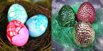 Другой вариант: обклеить паетками или другими подручными материалами скорлупу создав подобие чешуек. Такие пасхальные яйца понравятся любителям огромных рептилий и фанатам "Парка юрского периода".