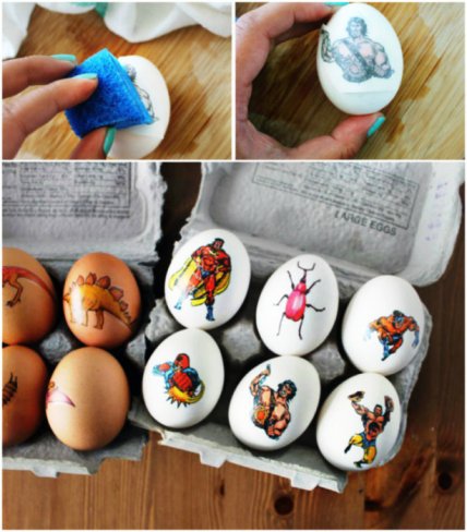 Из огромного количества нарисованных персонажей можно выбрать любимые и создать красочные пасхальные яйца. Для их росписи используются акриловые краски или гуашь. Можно создать 3D эффект, дополнив бумажными элементами. Несомненно к изготовлению стоит привлечь детей, позволив им проявить фантазию и возможность создать своего персонажа.