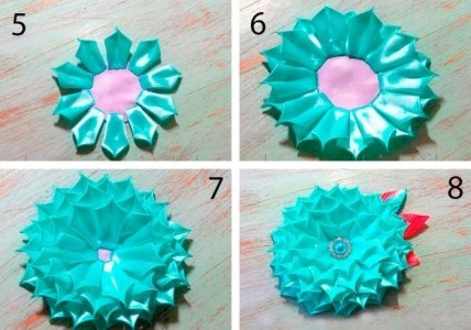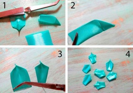 Подготовьте 50 отрезков бирюзовой ленты размером 2,5х4 см каждый.Возьмите отрезок ленты и сделайте лепесток, используя пинцет и огонь, как показано на фото. Таким способом превратите все отрезки в лепестки.