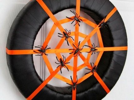 Вам понадобится: пенопластовый круг, клеевой пистолет, широкая атласная чёрная лента, тоненькая атласная лента оранжевого цвета, декоративные паучки, ножницы.