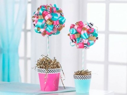 Вам понадобится: ленты, клеевой пистолет, ножницы, линейка, горшочек для цветка, 2 пенопластовых шара, карандаш, картонная трубочка для стебля, скотч с рисунком, мишура либо серпантин.