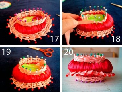 Закрепите розовую ленту иголочкой без бусины и оплетите иголки по периметру мыла, как показано на изображении.Оплетите розовой лентой 3 раза, чтобы получилось 3 ряда.