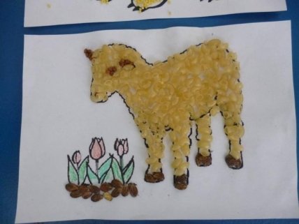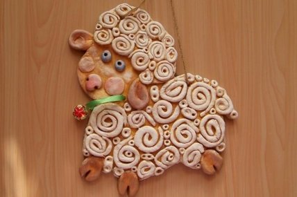 Основанием для таких поделок служит картон, плотная бумага или лист фанеры. Подобным образом можно оклеить даже ёлочные украшения. Инсталляции из макарон допускается выкрасить любой понравившейся краской.