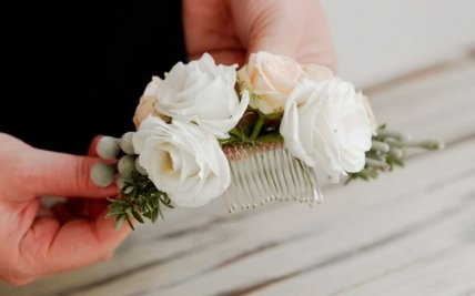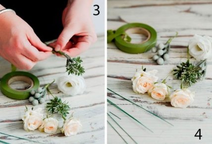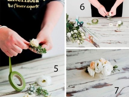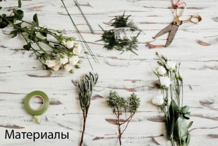 Вам понадобится: 4 кремовые розы, 3 белых цветка лизиантуса, цветочные веточки, металлический гребень для фаты, ножницы, флористическая проволока, тейп-лента зелёного цвета.
