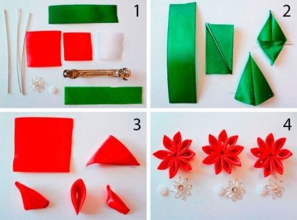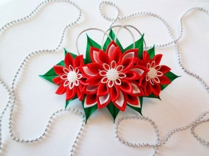 Вам понадобится: заколка-автомат длинною 10 см, атласные ленты красного, белого и зелёного цвета, ножницы, клеевой пистолет, зелёный фетр, линейка, паяльник, нитка с иголкой, серебристый шнурок, белые полубусины, 3 декоративных маленьких цветочка.