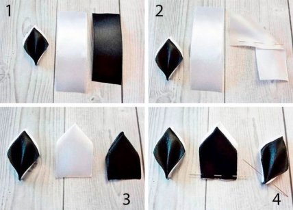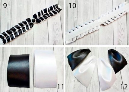 Сформируйте белый бант из 4х белых отрезков размером 5х10 см, затем чёрный бант из отрезков размером 5х9 см. Также сделайте маленький белый бантик из отрезков размером 5х9 см.